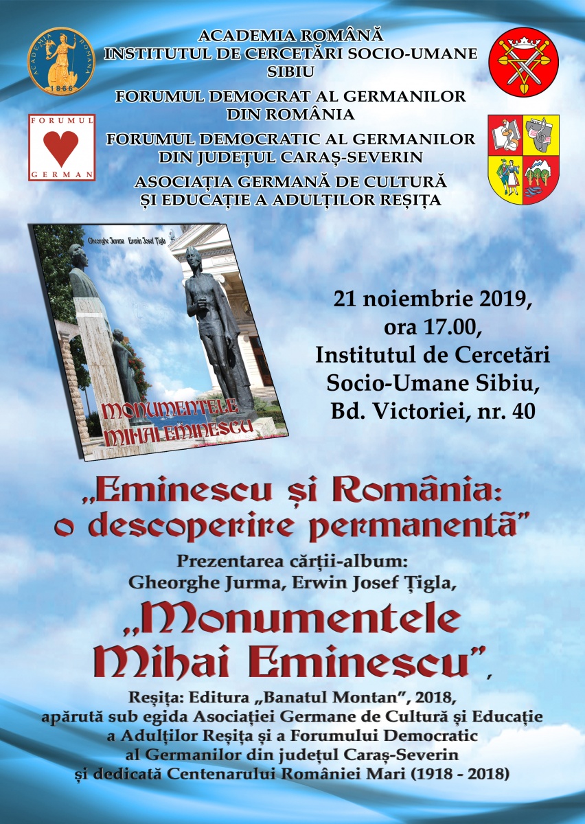 Joi, 21 noiembrie 2019, Institutul de Cercetări Socio-Umane Sibiu găzduiește evenimentul "Eminescu și România - o descoperire permanentă" în cadrul căruia va fi prezentat albumul "Monumentele Mihai Eminescu", apărut sub egida Forumului Democratic German din județul Caraș Severin, Asociația de Cultură și Educație a Adulților Reșița, la Editura Banatul Montan din Reșița, avându-i ca autori pe Gheorghe Jurma și pe Erwin Țigla.